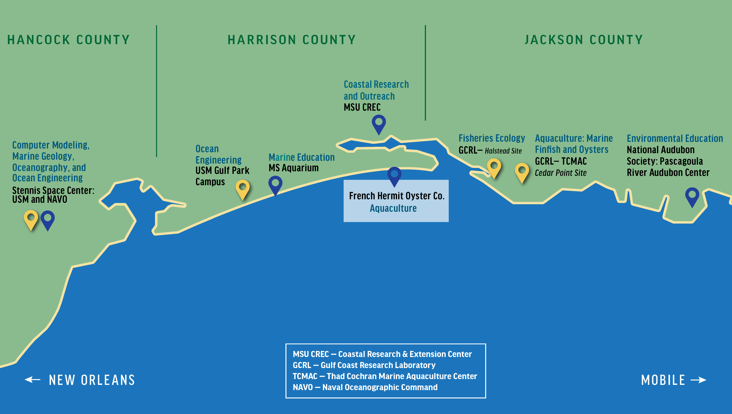University of Southern Mississippi labs: aquaculture, computer modeling, marine geology, and ocean engineering, Mississippi State University's Coastal Research and Extension Center, French Hermit Oyster Company, Mississippi Aquarium, Naval Oceanography Command, and Pascagoula River Audubon Center.